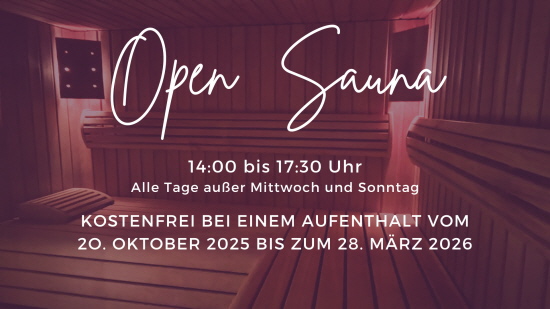 Alle Tage außer Mittwoch und Sonntag steht die Sauna von 14:00 Uhr bis 17:30 Uhr unseren Hotelgästen kostenfrei zur Verfügung.